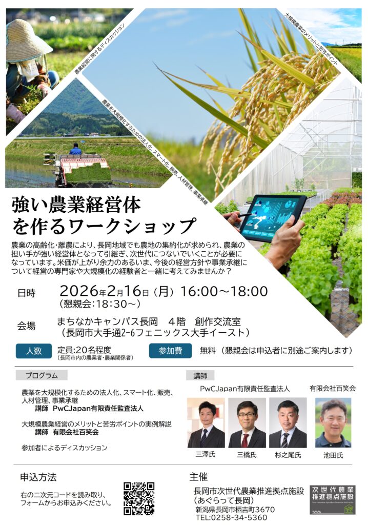 このイベントは、長岡市次世代農業推進拠点施設が実施する「農業者等の研修、交流の場の提供」事業です。